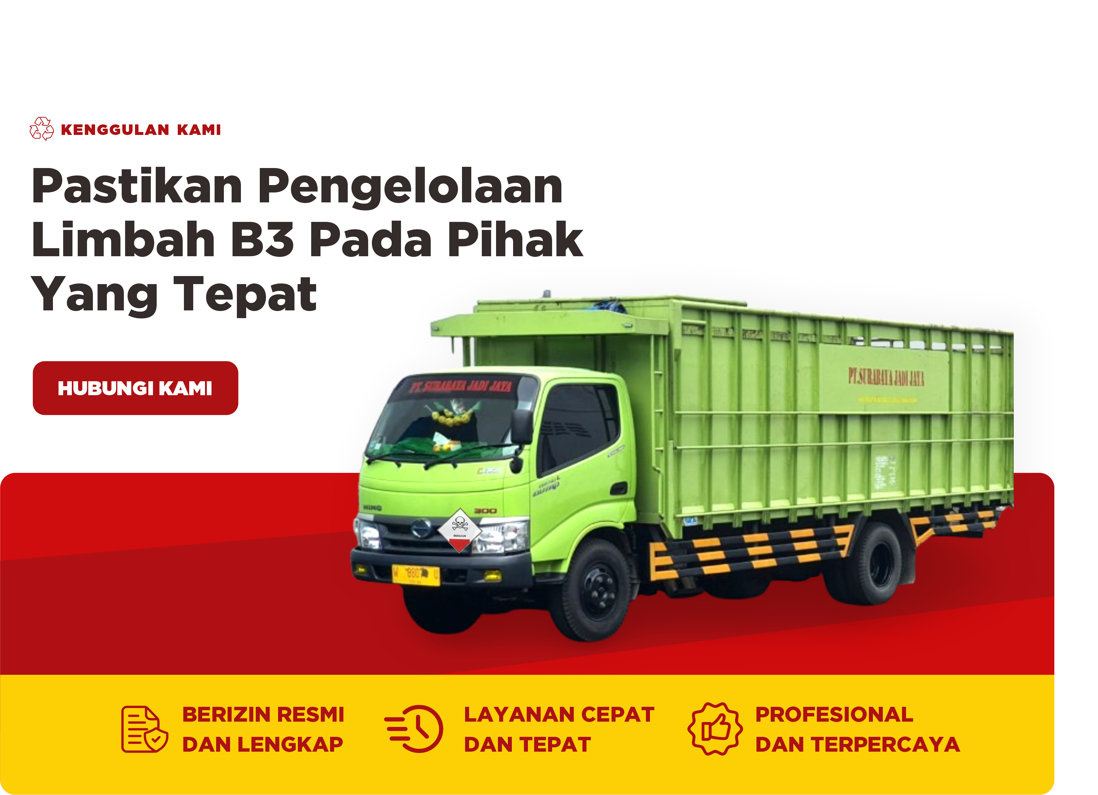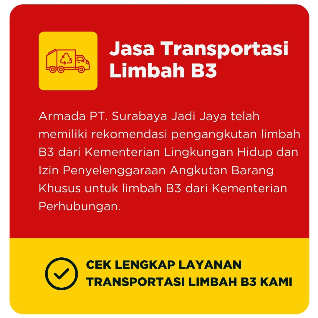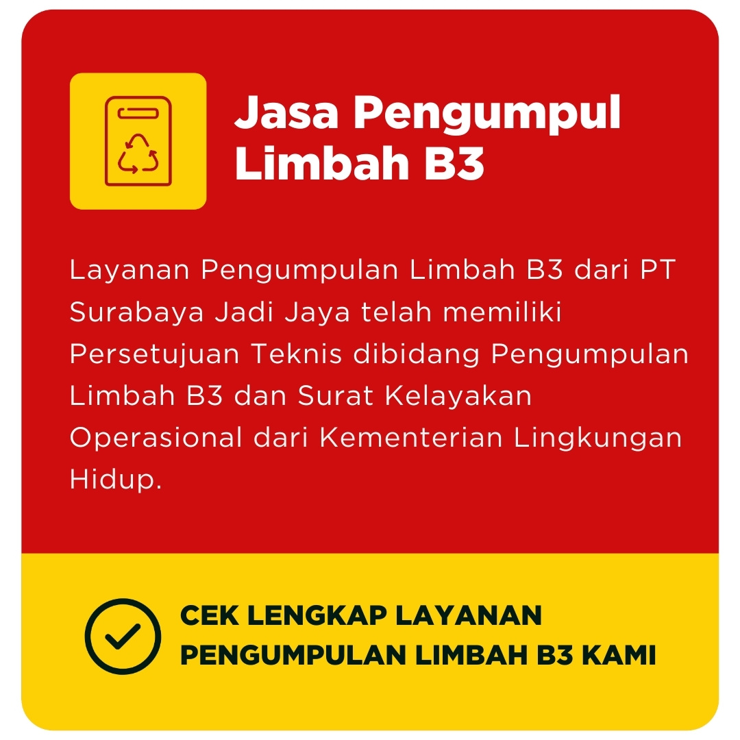 Perusahaan yang bergerak dibidang jasa pengelolaan limbah bahan berbahaya dan beracun (B3). PT. Surabaya Jadi Jaya bekerja sama dengan pihak industri lainnya dalam berbagai hal untuk penanganan permasalahan Limbah B3. Kami hadir untuk memastikan setiap limbah yang dihasilkan dikelola secara aman, legal, dan sesuai izin yang berlaku. Memiliki perizinan pengelolaan limbah B3 dari Kementerian Lingkungan Hidup (KLH) yang lengkap, dan didukung tenaga kerja berpengalaman dan profesional, serta armada yang memadai kami siap memberikan pelayanan dari tahap awal hingga tahap akhir untuk penanganan limbah B3 secara efektif dan efisien.